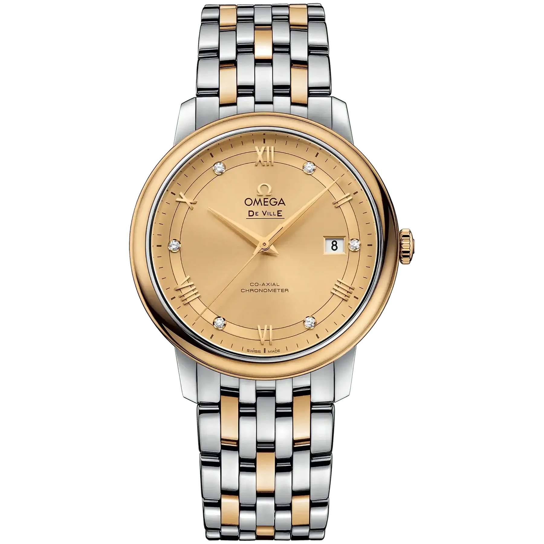 This Omega De Ville PRESTIGE – CO-AXIAL CHRONOMETER watch has a 39.5mm stainless steel 18K Yellow gold case. This model also features an automatic movement, stainless steel bracelet with yellow gold, sapphire anti-reflective crystal and a sun-brushed champagne dial with diamonds. It has a water resistance of 30m